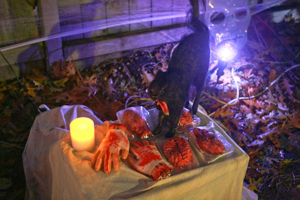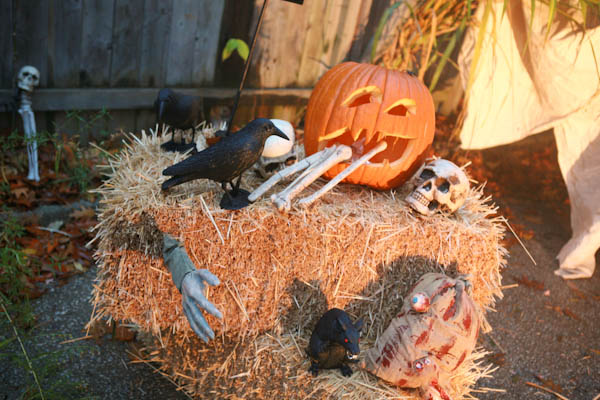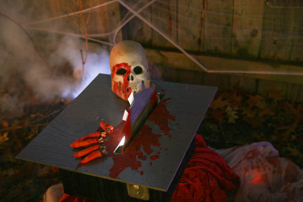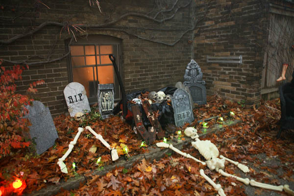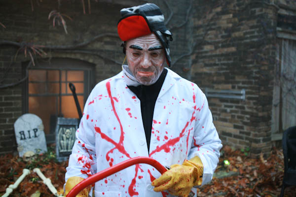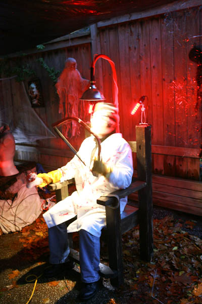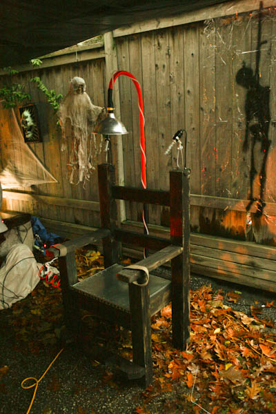 Oh what a night! We successfully constructed our haunted lane way in the rain and managed to scare the neighbourhood kids to death. Mission accomplished. All the new and old neighbours of Ed Evans Lane joined in this year and we had a blast. My neighbour John, who loves Halloween as much as I do…..blessed us with a new edition this year. He built…..from scratch…..an ELECTRIC CHAIR!!!!! I can’t tell you how many laughs we got from that thing…including one at my own expense. I was the guinea pig and got to try it out for the first time. Glad that was caught on video for endless replay and a good belly laugh.
